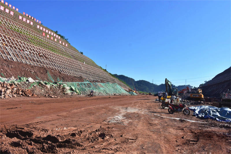 在金雞關(guān)開(kāi)挖現(xiàn)場(chǎng),貨車(chē)往來(lái)運(yùn)輸著物料,挖掘機(jī)、吊車(chē)等各司其職,在機(jī)械和車(chē)輛碾壓下,土路基已較為平坦,道路初具雛形。