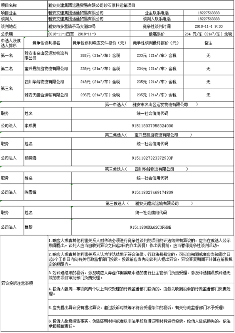 雅安交建集團(tuán)運(yùn)通貿(mào)易有限公司砂石原料運(yùn)輸項(xiàng)目競(jìng)爭(zhēng)性談判中選人及候選人公示