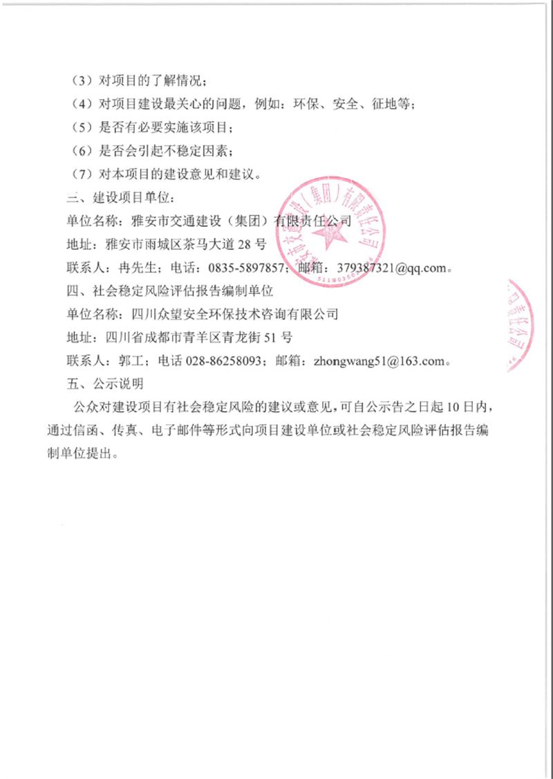 成雅高速金雞關(guān)互通及服務(wù)區(qū)項目(雨名快速通道)社會穩(wěn)定風(fēng)險評估公眾參與公示