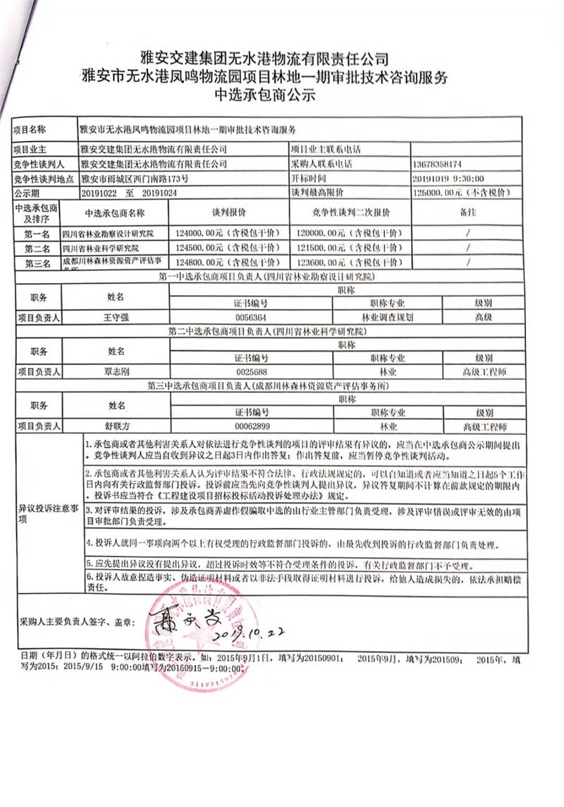 雅安交建集團無水港物流有限責任公司雅安市無水港鳳鳴物流園項目林地一期審批技術(shù)咨詢服務(wù)中選承包商公示