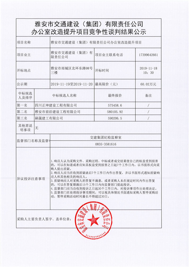 雅安市交通建設(shè)(集團(tuán))有限責(zé)任公司辦公室改造提升項(xiàng)目競(jìng)爭(zhēng)性談判結(jié)果公示