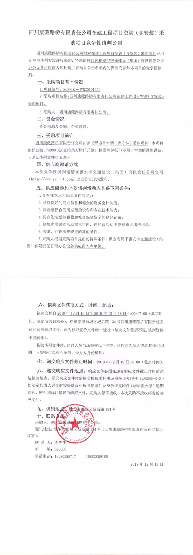 四川康藏路橋有限責任公司在建工程項目空調(diào)(含安裝)采購項目競爭性談判公告