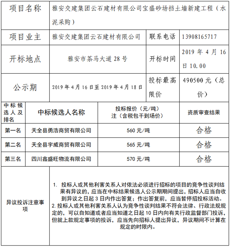 寶盛砂場擋土墻新建工程(水泥采購)項(xiàng)目競爭性談判結(jié)果公示