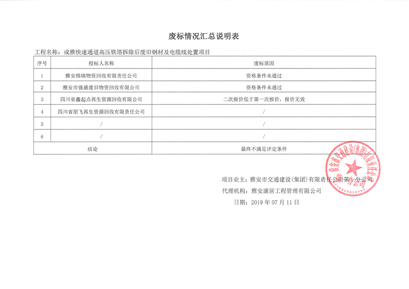 雅安市交通建設(shè)(集團(tuán))有限責(zé)任公司第一分公司成雅快速通道高壓鐵塔拆除后廢舊鋼材及電纜線處置項目廢標(biāo)情況匯總說明表
