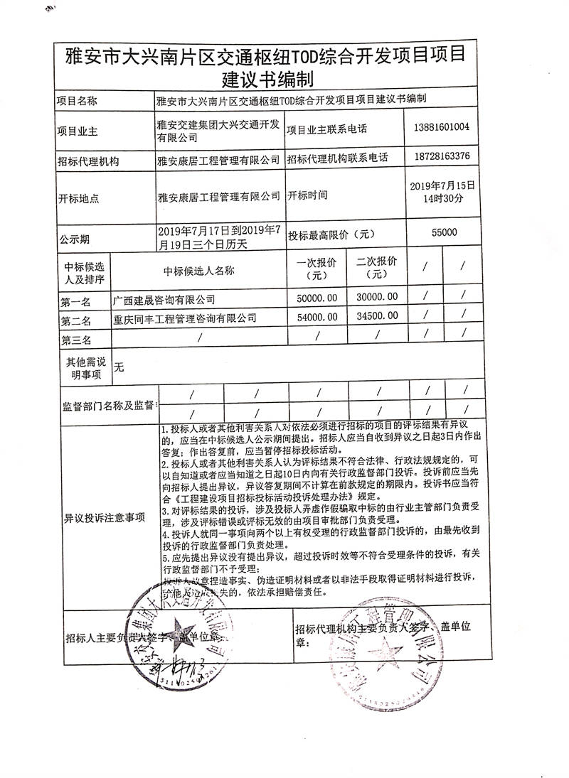 雅安交建集團(tuán)大興交通開(kāi)發(fā)有限公司雅安市大興南片區(qū)交通樞紐TOD綜合開(kāi)發(fā)項(xiàng)目項(xiàng)目建議書(shū)編制競(jìng)爭(zhēng)性談判結(jié)果公示