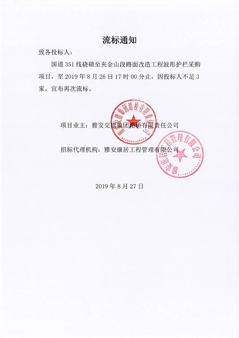 雅安交建集團(tuán)路橋有限責(zé)任公司國道351線蹺磧至夾金山段路面改造工程波形護(hù)欄采購項(xiàng)目流標(biāo)通知