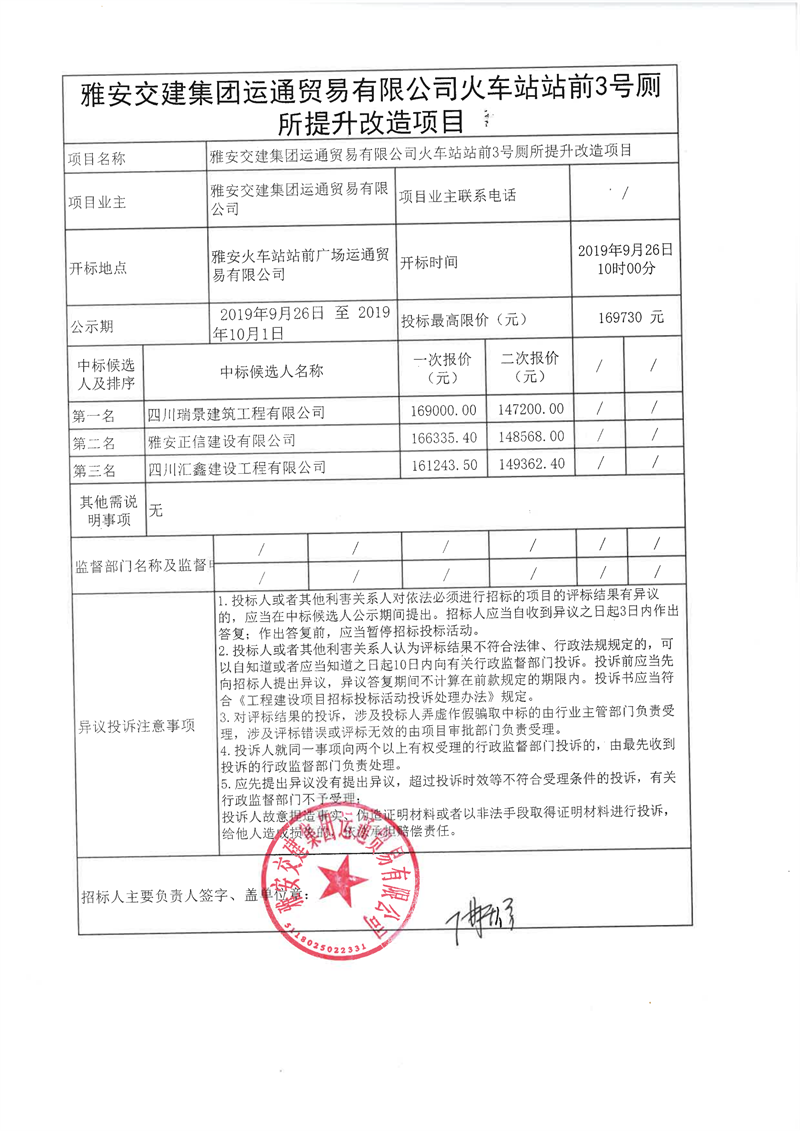 雅安交建集團(tuán)運(yùn)通貿(mào)易有限公司火車站站前廣場3號(hào)廁所改造提升項(xiàng)目(第二次)競爭性談判結(jié)果公示