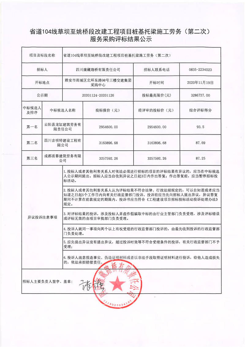 四川康藏路橋有限責任公司省道104線草壩至姚橋段改建工程項目樁基托梁施工勞務(第二次)服務采購評標結果公示
