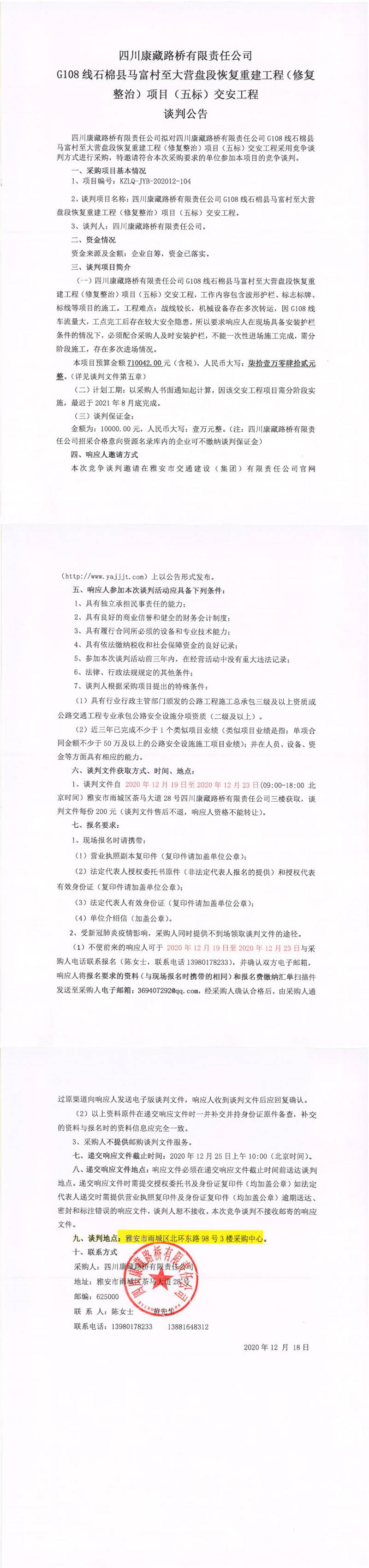 四川康藏路橋有限責(zé)任公司G108線(xiàn)石棉縣馬富村至大營(yíng)盤(pán)段恢復(fù)重建工程(修復(fù)整治)項(xiàng)目(五標(biāo))交安工程談判公告