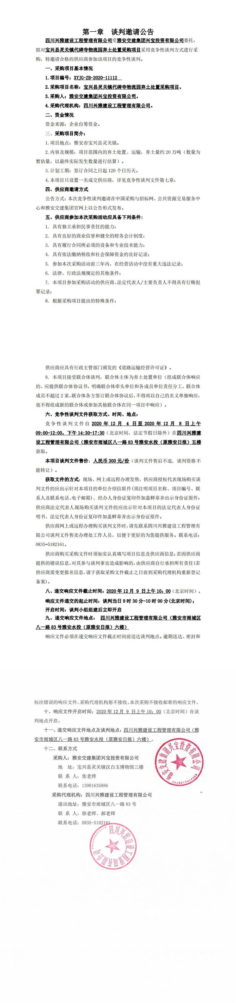 雅安交建集團(tuán)興寶投資有限公司寶興縣靈關(guān)鎮(zhèn)代碑寺物流園棄土處置采購項目談判公告