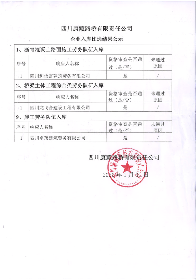 四川康藏路橋有限責(zé)任公司企業(yè)入庫(kù)比選結(jié)果公示