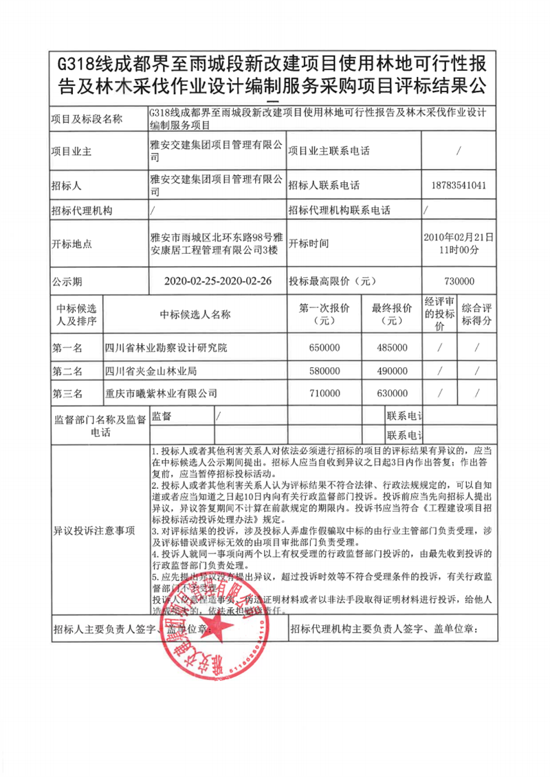 雅安交建集團(tuán)項(xiàng)目管理有限公司G318線(xiàn)成都界至雨城段新改建項(xiàng)目使用林地可行性報(bào)告及林木采伐作業(yè)設(shè)計(jì)編制服務(wù)采購(gòu)項(xiàng)目評(píng)標(biāo)結(jié)果公示