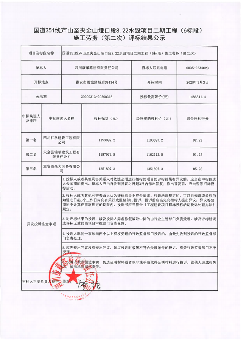 四川康藏路橋有限責(zé)任公司國(guó)道351線蘆山至夾金山埡口段8.22水毀項(xiàng)目二期工程(6標(biāo)段)施工勞務(wù)(第二次)評(píng)標(biāo)結(jié)果公示