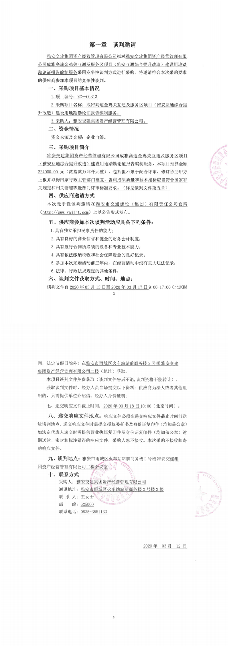 雅安交建集團(tuán)資產(chǎn)經(jīng)營管理有限公司成雅高速金雞關(guān)互通及服務(wù)區(qū)項目(雅安互通綜合提升改造)建設(shè)用地踏勘論證報告編制服務(wù)競爭性談判公告