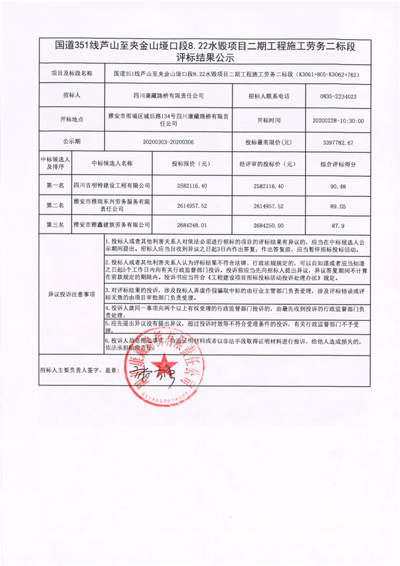 四川康藏路橋有限責(zé)任公司國(guó)道351線蘆山至夾金山埡口段8.22水毀項(xiàng)目二期工程施工勞務(wù)二標(biāo)段評(píng)標(biāo)結(jié)果公示