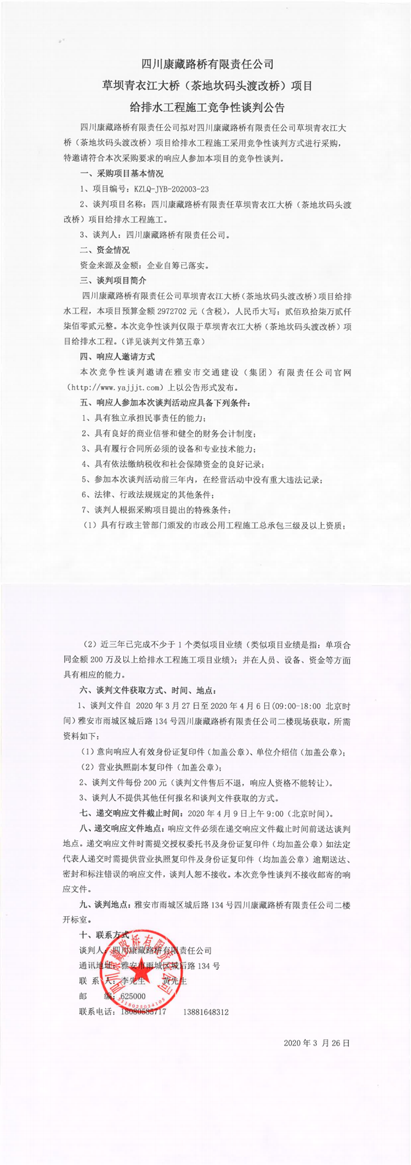 四川康藏路橋有限責(zé)任公司在建項(xiàng)目草壩青衣江大橋(茶地坎碼頭渡改橋)項(xiàng)目給排水工程施工競(jìng)爭(zhēng)性談判公告