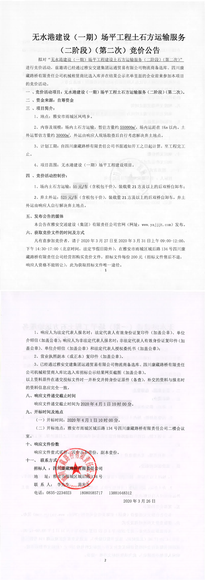 四川康藏路橋有限責任公司無水港建設(一期)場平工程建設土石方運輸服務(二階段)(第二次)競價公告