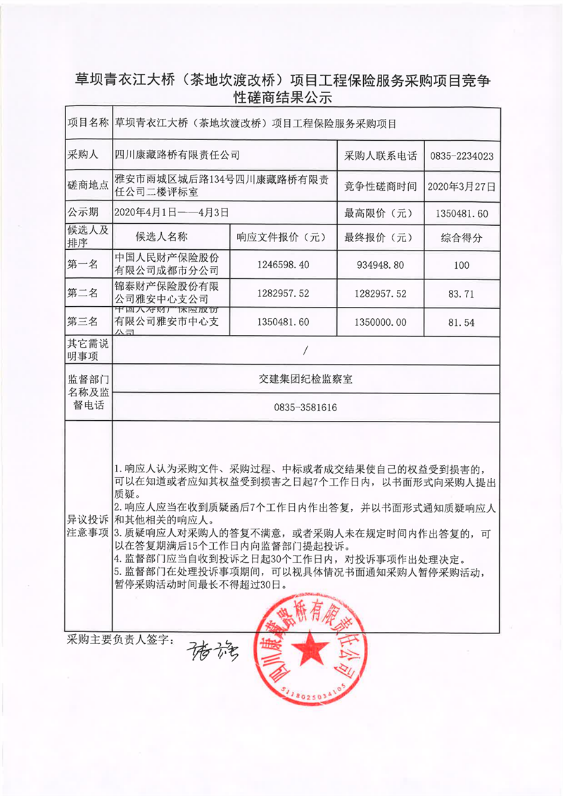 四川康藏路橋有限責(zé)任公司草壩青衣江大橋(茶地坎渡改橋)項目工程保險服務(wù)采購項目競爭性磋商結(jié)果公示