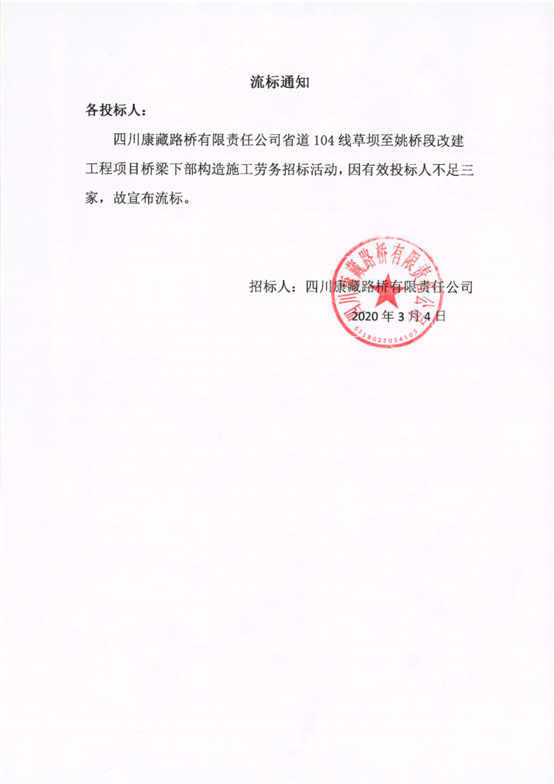 四川康藏路橋有限責任公司省道104線草壩至姚橋段改建工程項目橋梁下部構(gòu)造施工勞務流標通知