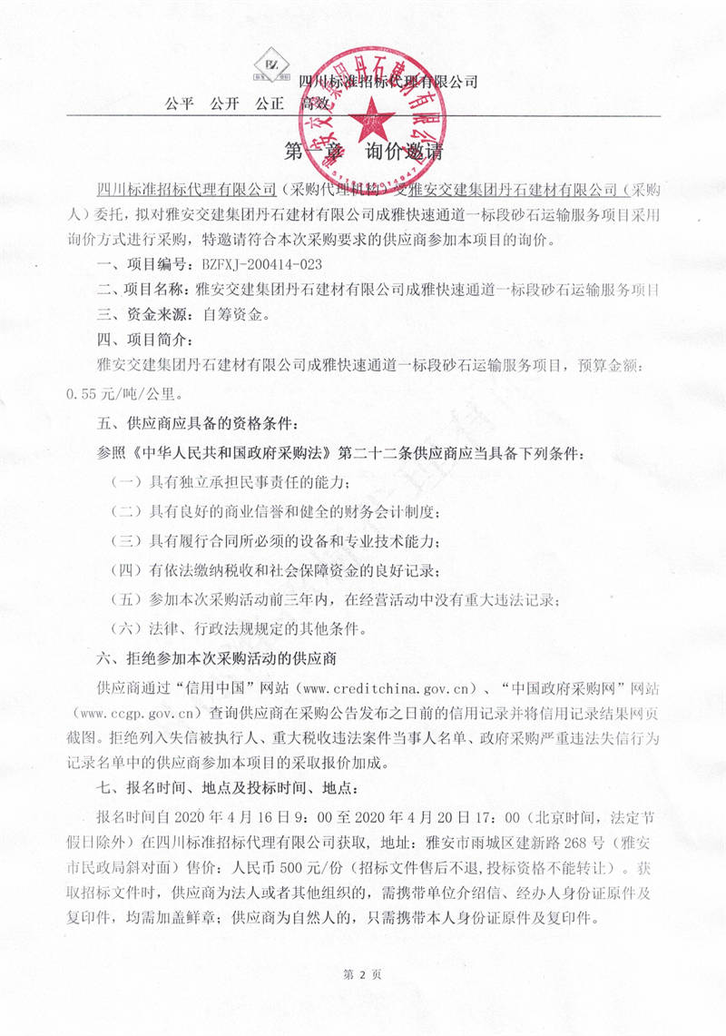 雅安交建集團(tuán)丹石建材有限公司成雅快速通道一標(biāo)段砂石運輸服務(wù)項目詢價公告