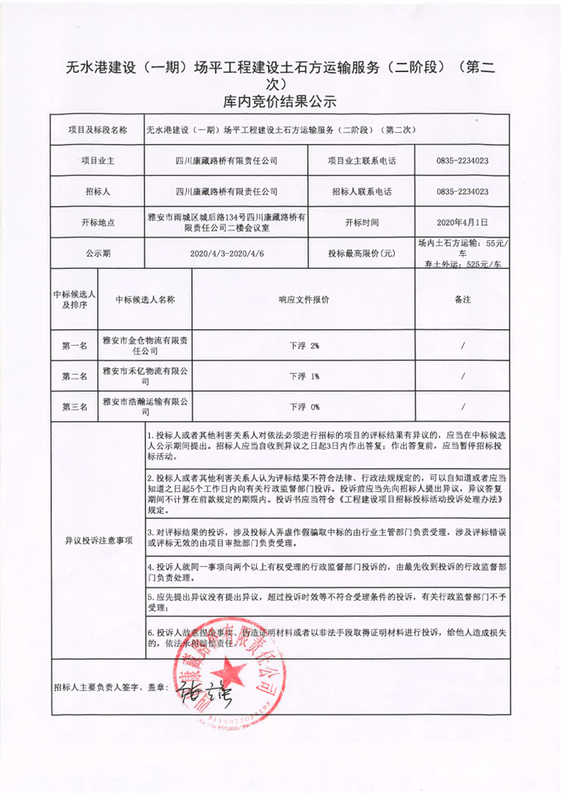 四川康藏路橋有限責(zé)任公司無水港建設(shè)(一期)場平工程土石方運(yùn)輸服務(wù)(二階段)(第二次)庫內(nèi)競價(jià)結(jié)果公示