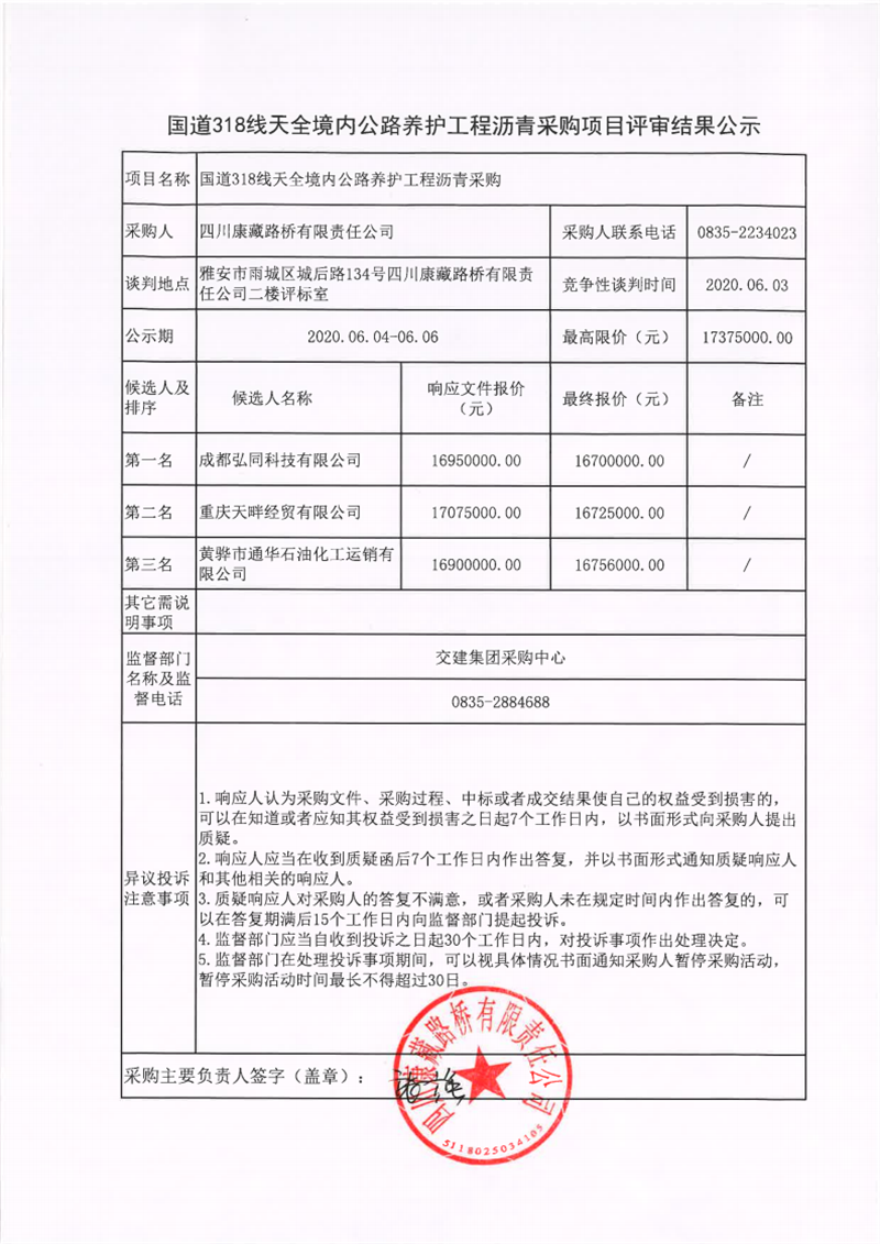 四川康藏路橋有限責(zé)任公司國道318線天全境內(nèi)公路養(yǎng)護(hù)工程瀝青采購項(xiàng)目評審結(jié)果公示