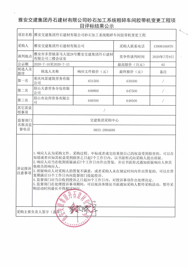 雅安交建集團(tuán)丹石建材有限公司砂石加工系統(tǒng)粗碎車間膠帶機(jī)變更工程項(xiàng)目評標(biāo)結(jié)果公示