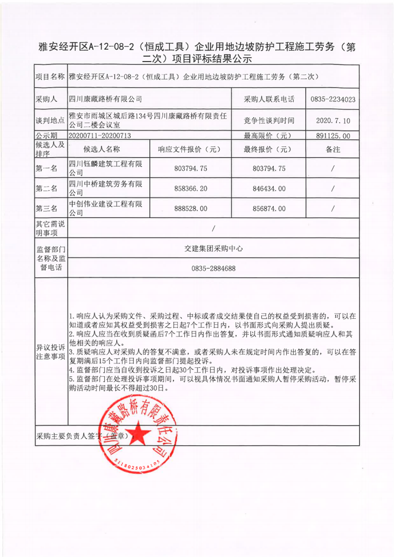 四川康藏路橋有限公司雅安經(jīng)開區(qū)A-12-08-2(恒成工具)企業(yè)用地邊坡防護(hù)工程施工勞務(wù)(第二次)項(xiàng)目評(píng)標(biāo)結(jié)果公示
