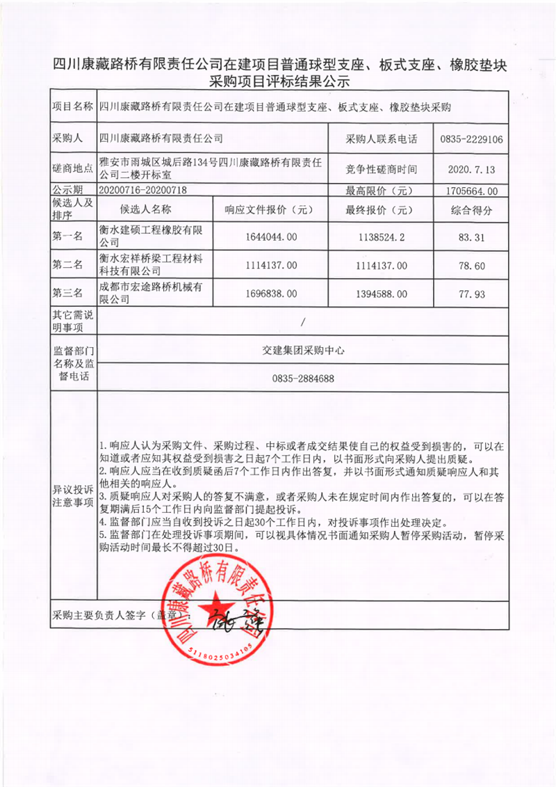 四川康藏路橋有限責任公司在建項目普通球型支座、板式支座、橡膠墊塊采購項目評標結果公示