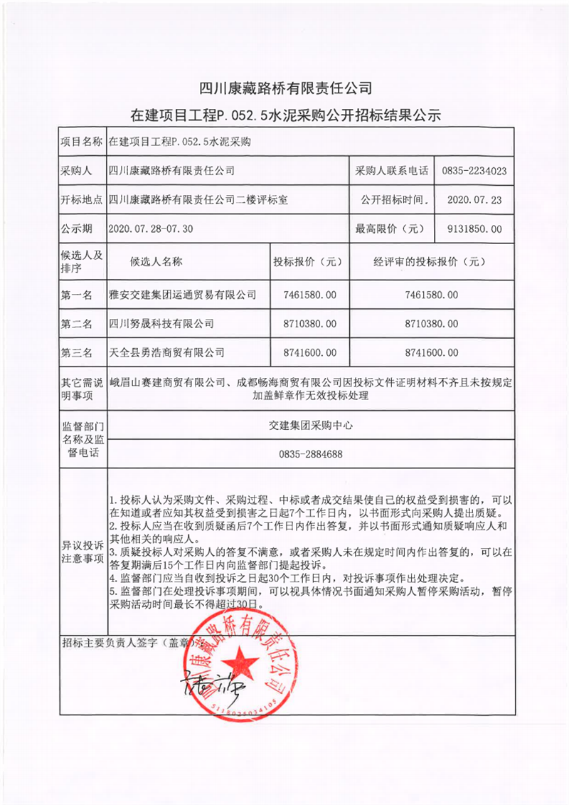 四川康藏路橋有限責(zé)任公司在建項(xiàng)目工程P.052.5水泥采購(gòu)公開(kāi)招標(biāo)結(jié)果公示