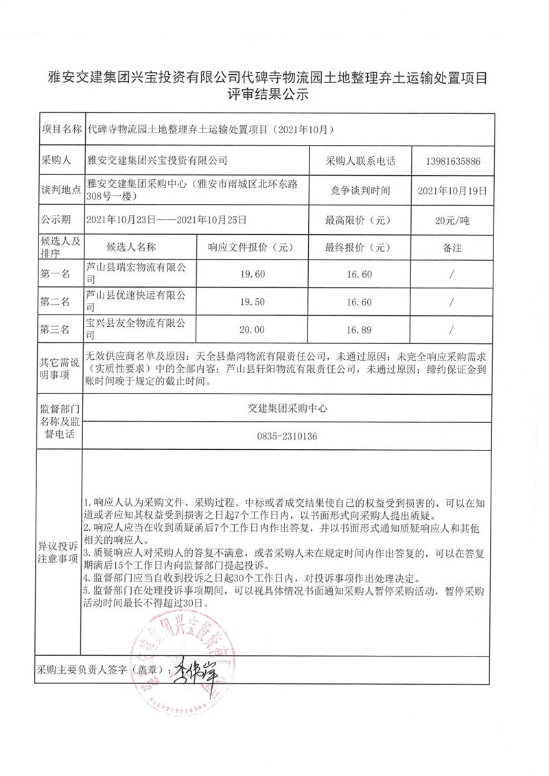 雅安交建集團興寶投資有限公司代碑寺物流園土地整理棄土運輸處置項目評審結(jié)果公示