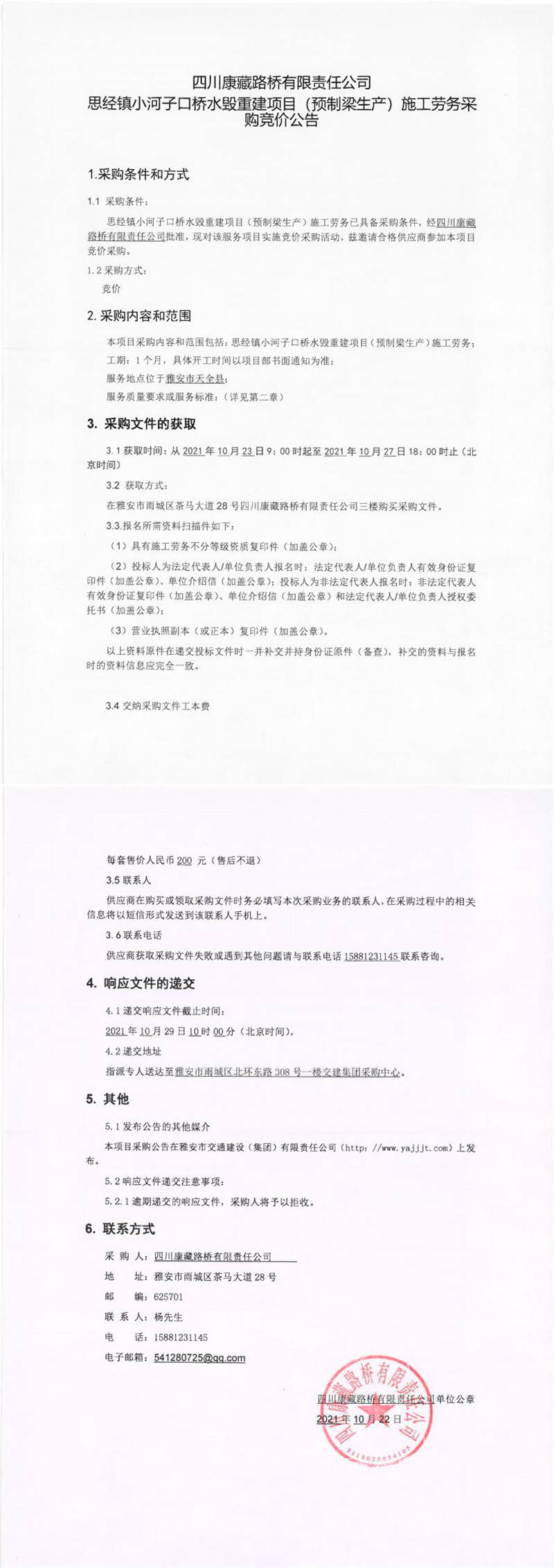四川康藏路橋有限責任公司思經(jīng)鎮(zhèn)小河子口橋水毀重建項目(預(yù)制梁生產(chǎn))施工勞務(wù)采購競價公告