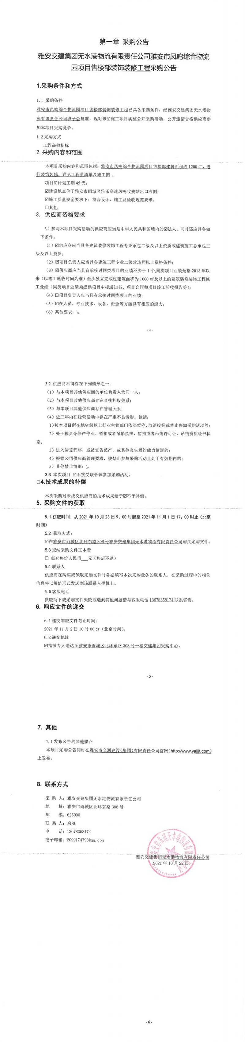 雅安交建集團無水港物流有限責任公司雅安市鳳鳴綜合物流園項目售樓部裝飾裝修工程(第二次)采購公告