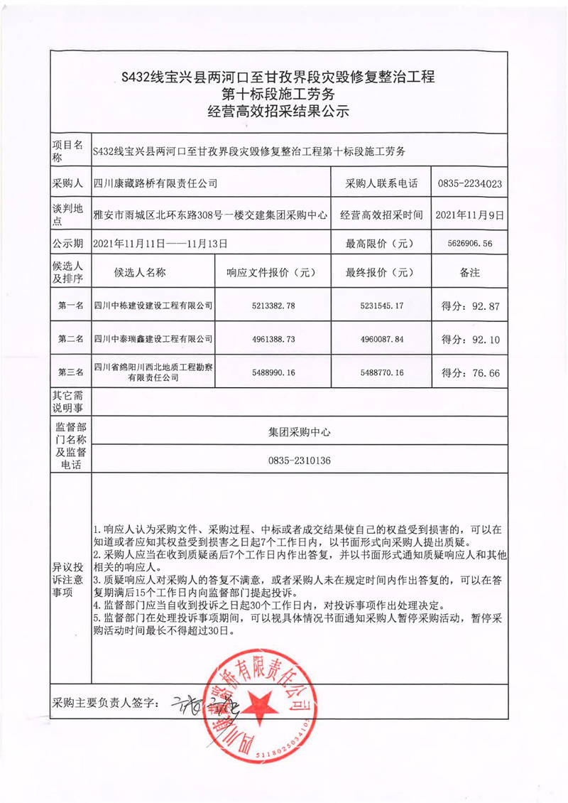 四川康藏路橋有限責(zé)任公司S432線寶興縣兩河口至甘孜界段災(zāi)毀修復(fù)整治工程第十標(biāo)段施工勞務(wù)經(jīng)營高效招采結(jié)果公示