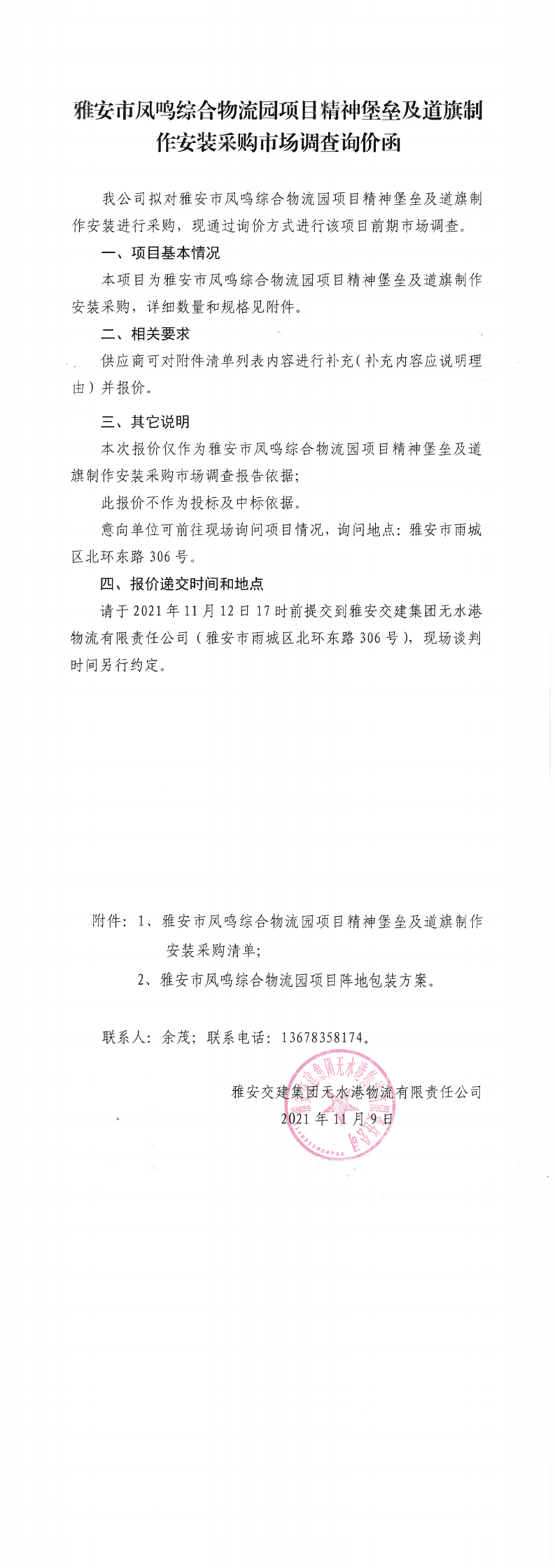 雅安交建集團(tuán)無水港物流有限責(zé)任公司雅安市鳳鳴綜合物流園項(xiàng)目精神堡壘及道旗制作安裝采購市場調(diào)查詢價(jià)函