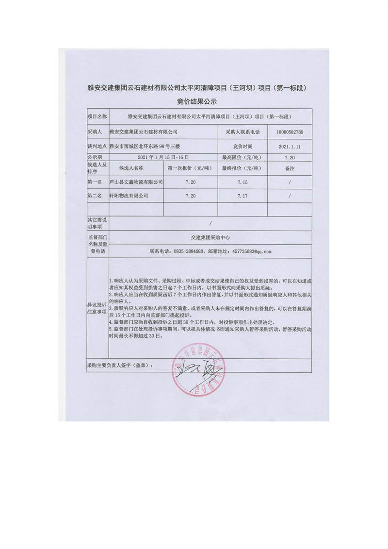 雅安交建集團云石建材有限公司太平河清障項目(王河壩)項目(第一標段)競價結果公示
