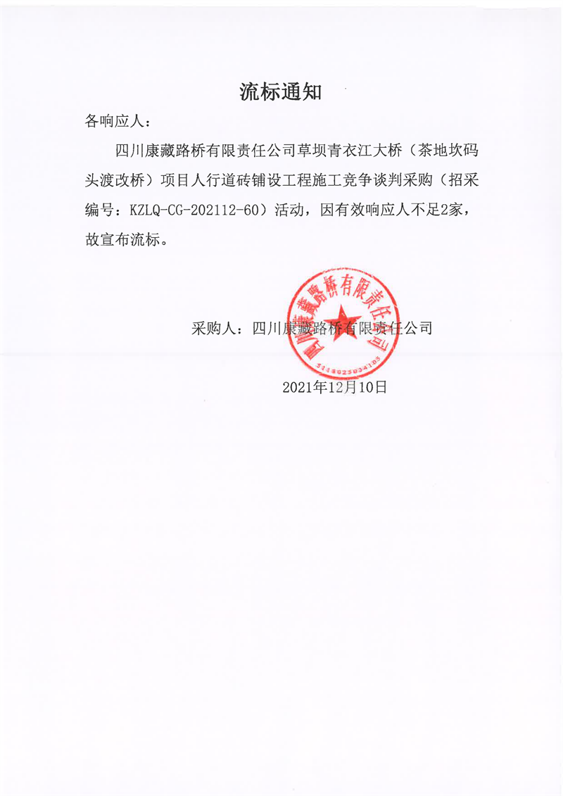 四川康藏路橋有限責(zé)任公司草壩青衣江大橋(茶地坎碼頭渡改橋)項(xiàng)目人行道磚鋪設(shè)工程施工競(jìng)爭談判采購流標(biāo)通知