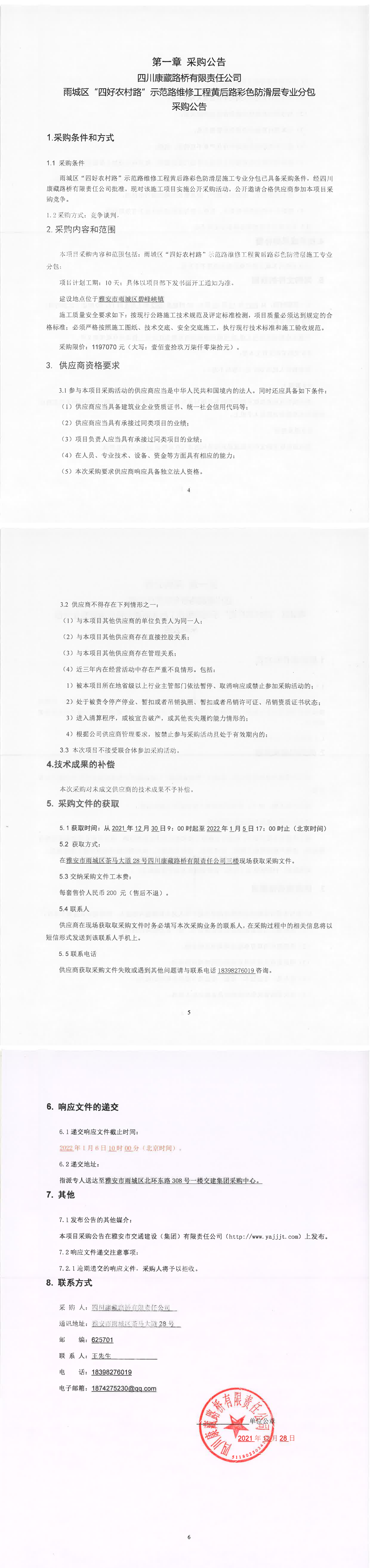 四川康藏路橋有限責任公司雨城區(qū)“四好農(nóng)村路”示范路維修工程黃后路彩色防滑層專業(yè)分包采購公告