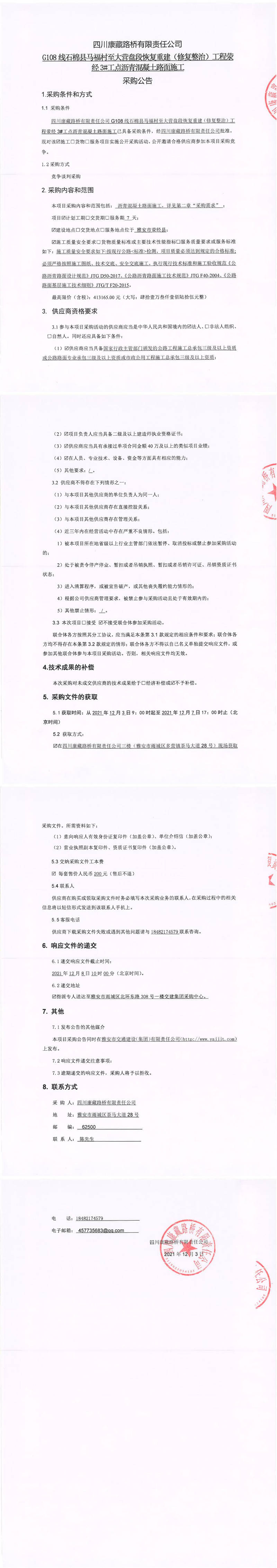 四川康藏路橋有限責(zé)任公司G108線石棉縣馬福村至大營(yíng)盤段恢復(fù)重建(修復(fù)整治)工程滎經(jīng)3#工點(diǎn)瀝青混凝土路面施工采購(gòu)公告