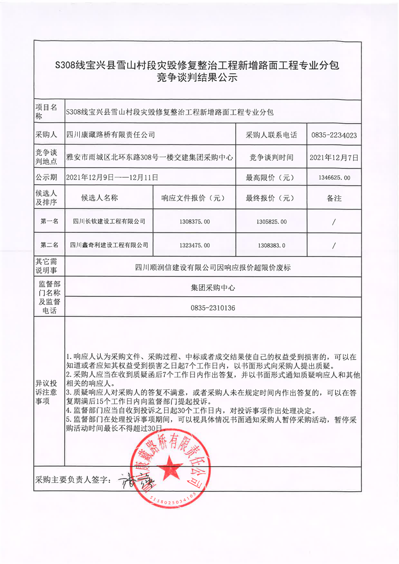 四川康藏路橋有限責(zé)任公司S308線寶興縣雪山村段災(zāi)毀修復(fù)整治工程新增路面工程專業(yè)分包競爭談判結(jié)果公示