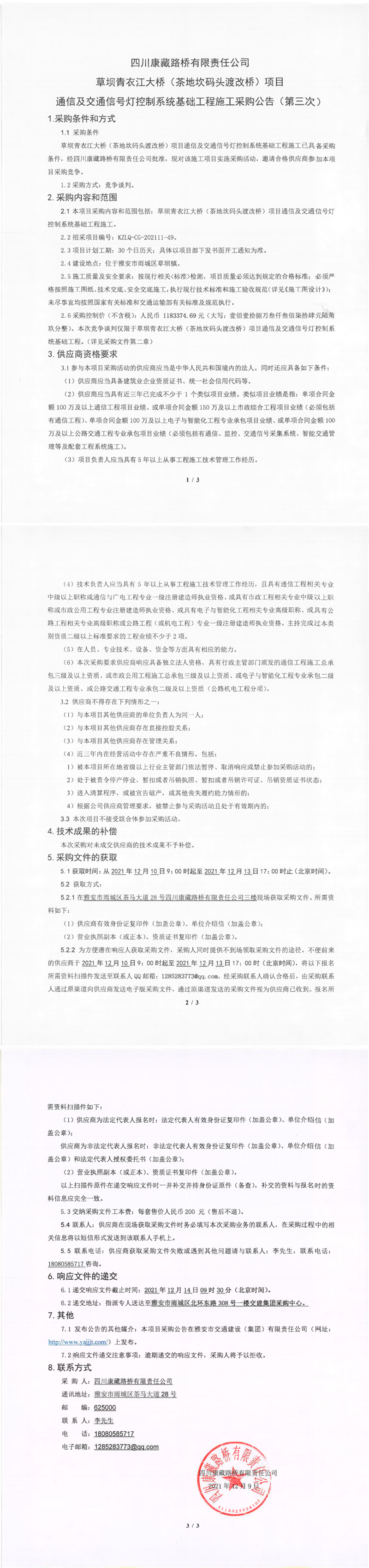 四川康藏路橋有限責任公司草壩青衣江大橋(茶地坎碼頭渡改橋)項目通信及交通信號燈控制系統(tǒng)基礎工程施工采購公告(第三次)
