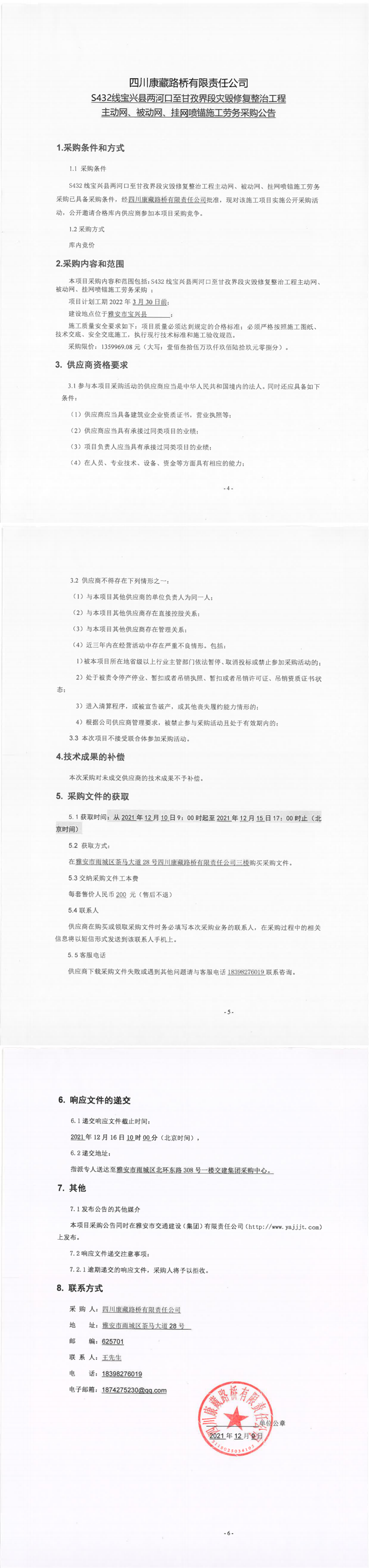 四川康藏路橋有限責(zé)任公司S432線寶興縣兩河口至甘孜界段災(zāi)毀修復(fù)整治工程主動網(wǎng)、被動網(wǎng)、掛網(wǎng)噴錨施工勞務(wù)采購公告
