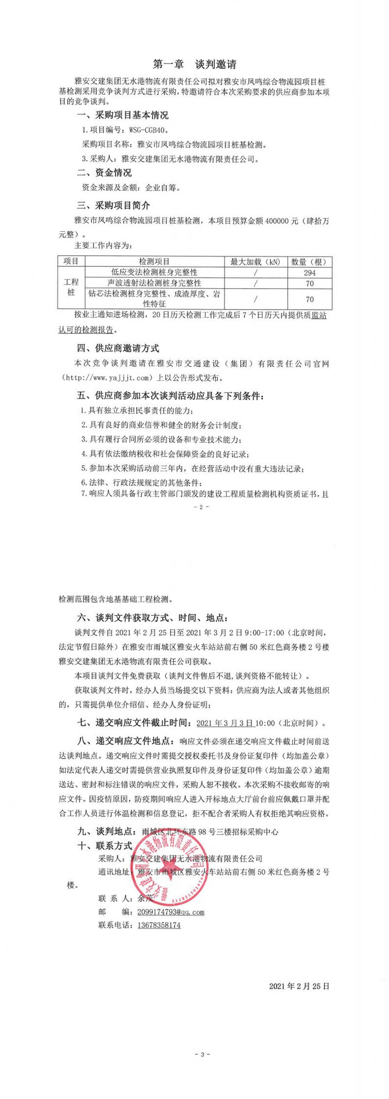 雅安交建集團無水港物流有限責任公司雅安市鳳鳴綜合物流園項目樁基檢測競爭談判公告