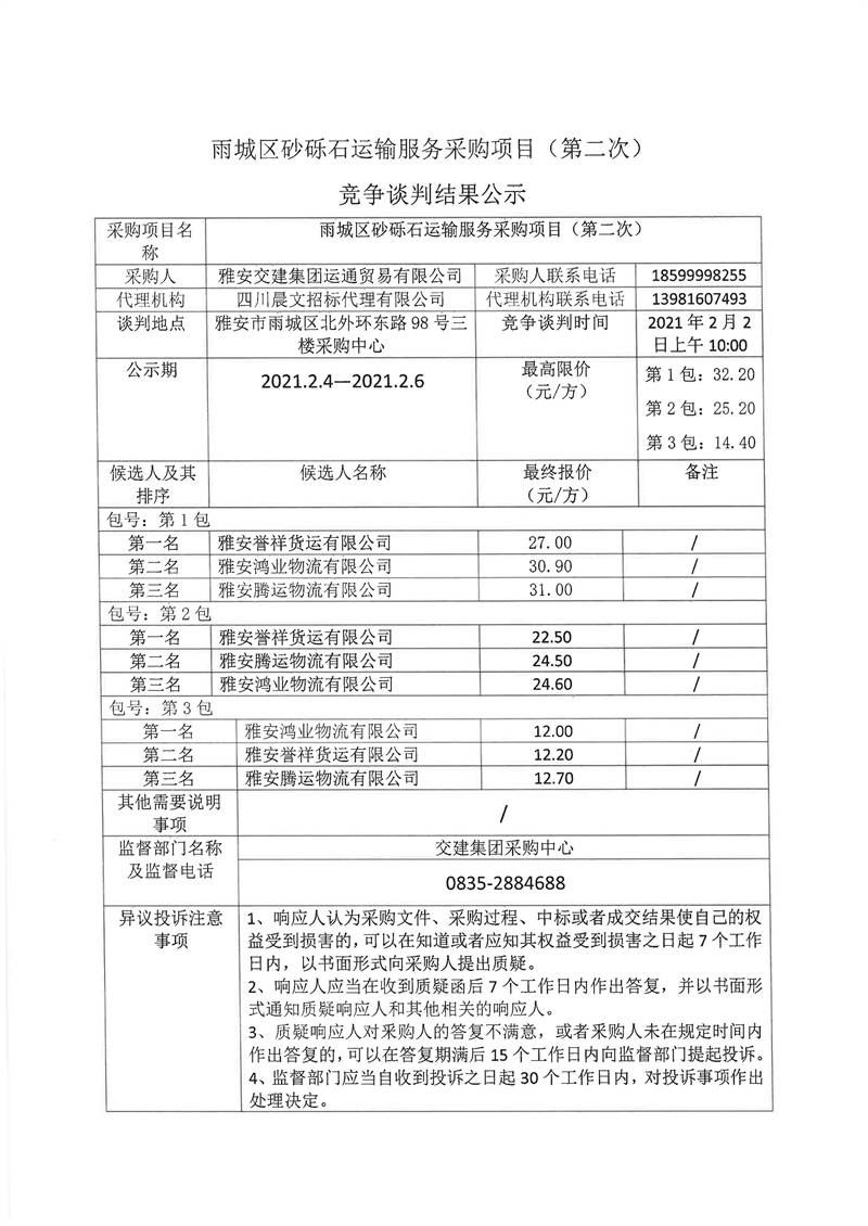 雅安交建集團運通貿(mào)易有限公司雨城區(qū)砂礫石運輸服務(wù)采購項目(第二次)競爭談判結(jié)果公示