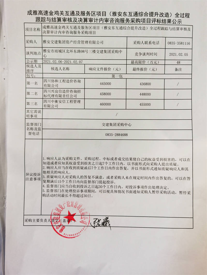 雅安交建集團(tuán)資產(chǎn)經(jīng)營(yíng)管理有限公司成雅高速金雞關(guān)互通及服務(wù)區(qū)項(xiàng)目(雅安東互通綜合提升改造)全過(guò)程跟蹤與結(jié)算審核及決算審計(jì)內(nèi)審咨詢服務(wù)評(píng)標(biāo)結(jié)果公示