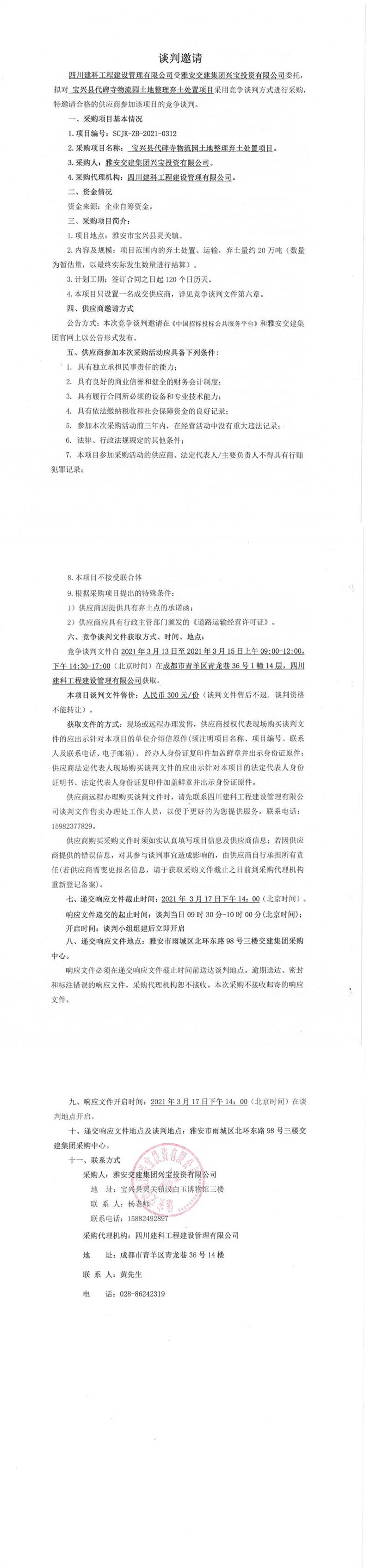 雅安交建集團興寶投資有限公司寶興縣代碑寺物流園土地整理棄土處置項目競爭談判公告