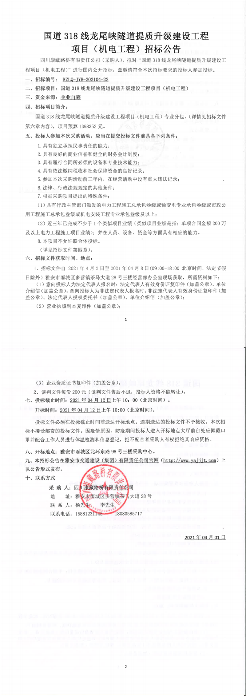 四川康藏路橋有限責(zé)任公司國道318線龍尾峽隧道提質(zhì)升級建設(shè)工程項(xiàng)目(機(jī)電工程)招標(biāo)公告