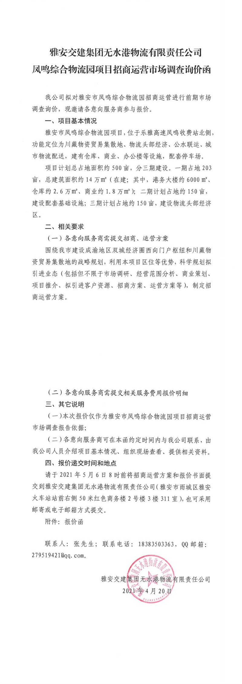 雅安交建集團(tuán)無水港物流有限責(zé)任公司鳳鳴綜合物流園項(xiàng)目招商運(yùn)營(yíng)市場(chǎng)調(diào)查詢價(jià)函