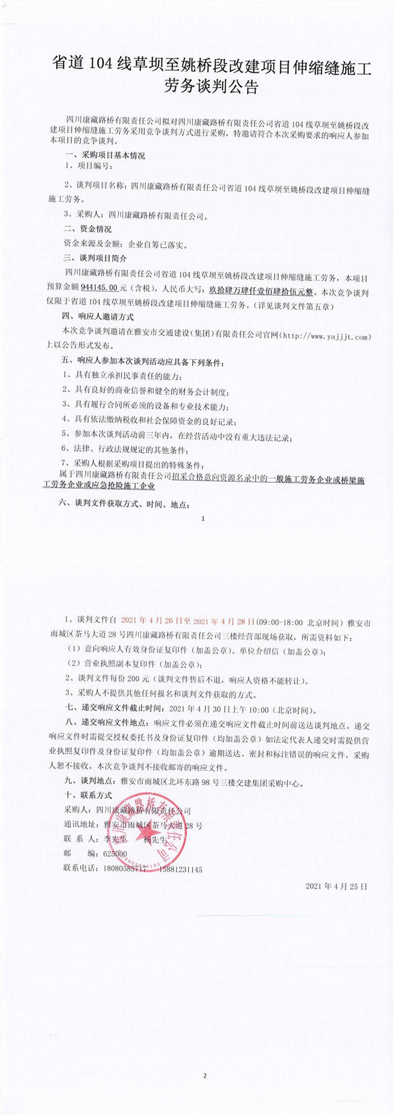 四川康藏路橋有限責(zé)任公司省道104線草壩至姚橋段改建項(xiàng)目伸縮縫施工勞務(wù)談判公告