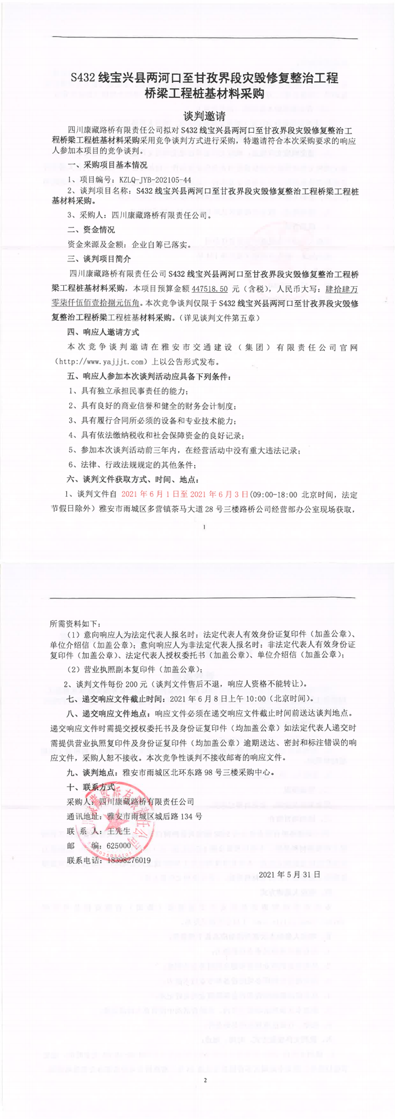 四川康藏路橋有限責(zé)任公司S432線(xiàn)寶興縣兩河口至甘孜界段災(zāi)毀修復(fù)整治工程橋梁樁基材料采購(gòu)競(jìng)爭(zhēng)談判公告